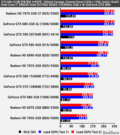 ±×·¡ÇÈÄ«µåµéÀÇ ¼ÒºñÀü·ÂÀº À©µµ¿ì ÁøÀÔ ÈÄ ¾Æ¹«·± ÀÛ¾÷À» ÁøÇàÇÏÁö ¾ÊÀº IDLE »óȲ°ú ·Îµå »óȲÀ» °í·ÁÇØ 3DMark Vantage Extreme Preset (1920 x 1200, 4xAA/ 16xAF)À» ¼±ÅÃÇÑ ÈÄ GPU Test1°ú GPU Test2¿¡¼ ÃøÁ¤µÈ ½Ã½ºÅÛÀÇ Àüü Æò±Õ¼ÒºñÀü·ÂÀ» ºñ±³Çß´Ù.