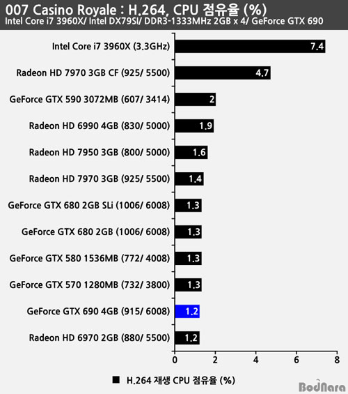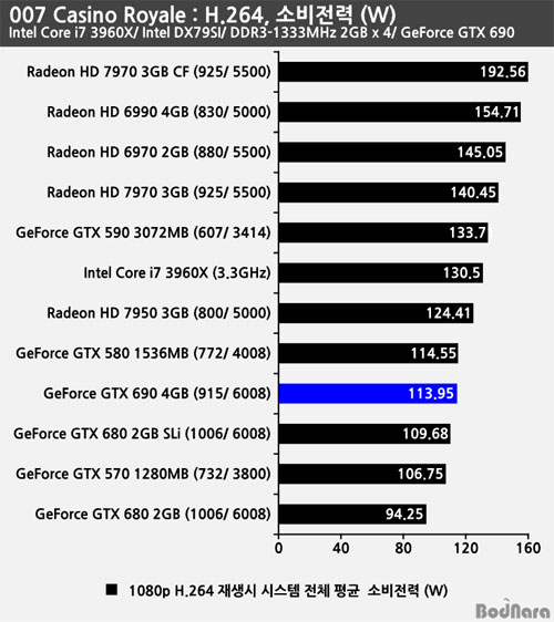 ¶óµ¥¿Â HD 7970Àº ÄÚ¾î 500/ ¸Þ¸ð¸® 5500 (1375)MHz, HD 7950Àº ÄÚ¾î 500, 5000 (1250)MHz, ÁöÆ÷½º GTX 590Àº ÄÚ¾î 50/ ½¦ÀÌ´õ 101/ ¸Þ¸ð¸® 270 (67.5)MHz, GTX 580/ 570Àº ÄÚ¾î 405/ ½¦ÀÌ´õ 810/ ¸Þ¸ð¸® 648 (162)MHz, ÁöÆ÷½º GTX 680Àº ÄÚ¾î 324/ ¸Þ¸ð¸® 648 (162)MHz·Î µ¿ÀÛÇØ H.264 ¿µ»óÀ» Àç»ýÇϹǷΠÀü·Â ¼Ò¸ð´Â 3D ÀÛ¾÷º¸´Ù´Â ÁÙ¾îµç´Ù.