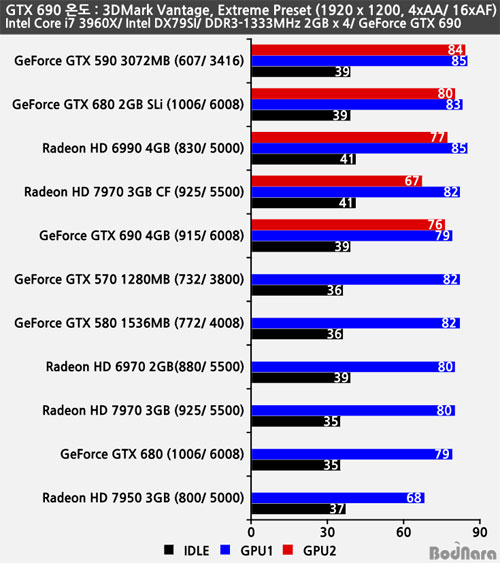¿Âµµ´Â °³¹æµÈ »óÅÂÀÇ »ç¹«½Ç¿¡¼ ÃøÁ¤ÇÏ¿´À¸¹Ç·Î ÄÉÀ̽º ³»ºÎ¿¡ ÀåÂøµÈ °æ¿ì¿Í ´Þ¶ó »ó´ëÀûÀÎ ºñ±³·Î Âü°íÇÏÀÚ. ÁöÆ÷½º GTX 690Àº 28nm ½Å°øÁ¤ µµÀÔ ¹× µ¿ÀÛ Å¬·° ¼³Á¤, Ä𸵠¼Ö·ç¼Ç Â÷ÀÌ·Î ÁöÆ÷½º GTX 680 2GB SLi ¹× ÁöÆ÷½º GTX 590º¸´Ù ³·Àº ¿Âµµ¸¦ Á¦°øÇß´Ù.