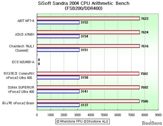 | À¯´ÏÅØ nForce2 Brain |  |  ¡¡ Sandra 2004ÀÇ CPU Arithmetic Å×½ºÆ®ÀÇ °á°ú°ªÀÌ FSB166/DDR333ÀÏ ¶§º¸´Ù