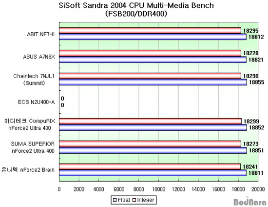 ¹è¼öÁ¶ÀýÀ» 9¹è¼ö·Î ¼³Á¤ÇÏ¿© ºñ½ÁÇÑ CPU Ŭ·° ÇÏ¿¡¼ Å×½ºÆ®¸¦ ÁøÇàÇß¾î¾ß ¸ÂÁö¸¸, ¹ÌµðÅ×Å©ÀÇ CompuRIX nForce2 Ultra