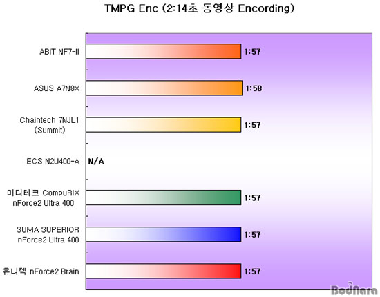 ½Ã°£À» º¸À̰í ÀÖ´Ù. TMPG Enc ÇÁ·Î±×·¥µµ ½ÃÀ۽à ȯ°æ¿¡ µû¶ó ½Ã°£¿¡ ¹Ì¼¼ÇÑ Â÷À̰¡ Àֱ⠶§¹®¿¡ ASUS A7N8X¿¡°Ô´Â ¿îÀÌ ¾ø¾ú´Ù.