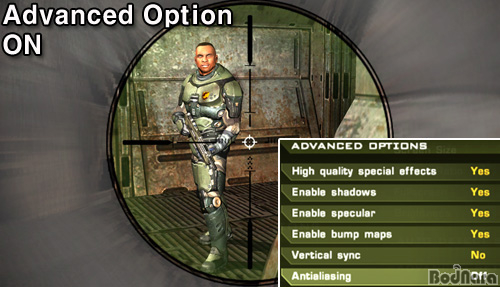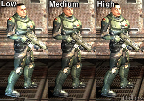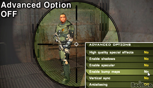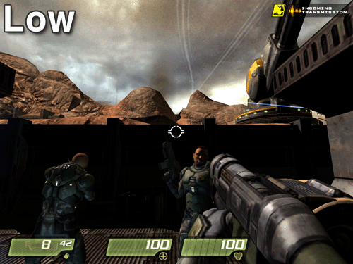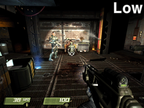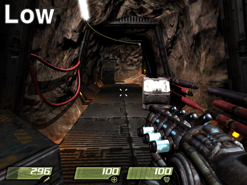 ¼º´É Å×½ºÆ®¿¡¼­µµ ¾ð±ÞÇßÁö¸¸ Quake4¿¡¼­ È­Áú Â÷À̸¦ ³»´Â ºÎºÐÀº Video Qualityº¸´Ù Advanced Option Ç׸ñ¿¡ ´õ ¸¹ÀÌ Á¿ìµÈ´Ù. °°Àº High ¸ðµå·Î ³õ´õ¶óµµ Advanced OptionÀ» ÀüºÎ OFF ½Ã۸é Low Ä÷¸®Æ¼º¸´Ùµµ ¸øÇÑ È­¸éÀÌ µÈ´Ù. ÃÑ¿¡ ´Þ¸° Á¶ÁذæÀ» ½áµµ Á¶Áذæ ÁÖº¯ºÎÀÇ ¿Ö°î È¿°úµµ Àû¿ëµÇÁö ¾Ê°í, ±×¸²ÀÚµµ ¾øÀ¸¸ç, ij¸¯ÅÍÀÇ µðÅ×ÀÏÀ̳ª ÇÏÀ̶óÀÌÆ® Ç¥Çöµµ µÇÁö ¾Ê¾Æ »ó´çÈ÷ ¹Ô¹ÔÇÑ È­¸éÀÌ µÈ´Ù.