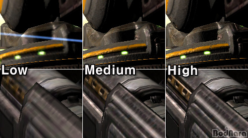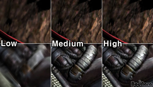 ±×·¸´Ù¸é ±×·¡ÇÈ Ç°Áú ¿É¼Ç¿¡ µû¸¥ °ÔÀÓ È­¸éÀÇ Â÷ÀÌ´Â ¾ó¸¶³ª ³¯±î? 1600x1200 ÇØ»óµµ¿¡¼­ Low - Medium - HighÀÇ ¼¼°¡Áö ¿É¼ÇÀ» ¼³Á¤ÇÏ¿© °¢°¢ÀÇ È­Áú Â÷À̸¦ »ìÆìº¸¾Ò´Ù. À§ÂÊÀÇ È­¸éÀº ÇØ´ç Àå¸éÀ» gif ÆÄÀÏ·Î ¸¸µé¾úÀ¸¸ç °¢ Àå¸éÀÇ ¾Æ·¡¿¡ 100% Å©·ÓÇÑ ºÎºÐÀ» ³ª¿­ÇØ ºñ±³Çϱ⠽±µµ·Ï ±¸¼ºÇß´Ù.