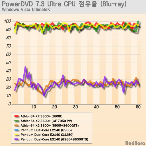AMD 690G, GeForce 7050 PV, Radeon X1250 ¸ðµÎ 90%¸¦ ³Ñ´Â CPU Á¡À¯À²À» º¸À̸鼭 ÇÁ·¹ÀÓÀÌ ²÷¾îÁö´Â µî ¿øÈ°ÇÑ Àç»ýÀ» ÇÏÁö ¸øÇß´Ù. ±×·¯³ª ºí·ç·¹ÀÌ¿ë ºñµð¿À Æ÷¸ËÀ» °¡¼ÓÇÒ ¼ö ÀÖ´Â GeForce 8600 GTS žÀç ½Ã½ºÅÛ¿¡¼­´Â 20~30% Á¤µµÀÇ ÄèÀûÇÑ ¸ð½ÀÀ» º¸¿© ºí·ç·¹ÀÌ ¿µÈ­¸¦ º¸¸é¼­ ´Ù¸¥ ÀÛ¾÷À» Çϴµ¥µµ ¹«¸®°¡ ¾øÀ» °ÍÀ¸·Î º¸ÀδÙ.