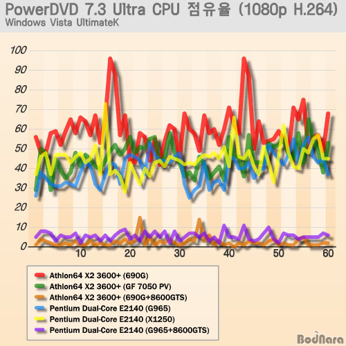 °¢ Å×½ºÆ®ÀÇ Æò±Õ CPU »ç¿ë·üÀ» ºñ±³Çϸé 1080p H.264 µ¿¿µ»óÀº Çϵå¿þ¾î °¡¼ÓÀ» Áö¿øÇÏÁö ¾Ê´Â ³»Àå ±×·¡ÇÈ ½Ã½ºÅÛµéÀº 40% ³»¿Ü¿´À¸¸ç, °°Àº Radeon X700 ±â¹ÝÀÌ¶óµµ ÀÎÅÚ¿ëÀ¸·Î ÄÚ¾î Ŭ·°À» ³ôÀÎ Radeon X1250(ABIT Fatal1ty F-I90HD)´Â »ç¿ë·üÀÌ ³·¾ÒÁö¸¸ ±âº» Ŭ·° ±×´ë·ÎÀÎ AMD 690G(ASUS M2A-VM- HDMI)´Â »ç¿ë·üÀÌ 10% ÀÌ»ó ³ô¾Æ¼­ ³»Àå ±×·¡ÇÈ Äھ ³ôÀº Ŭ·°À» °¡Áø ÂÊÀÌ À¯¸®ÇÑ °ÍÀ¸·Î ³ªÅ¸³µ´Ù.