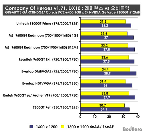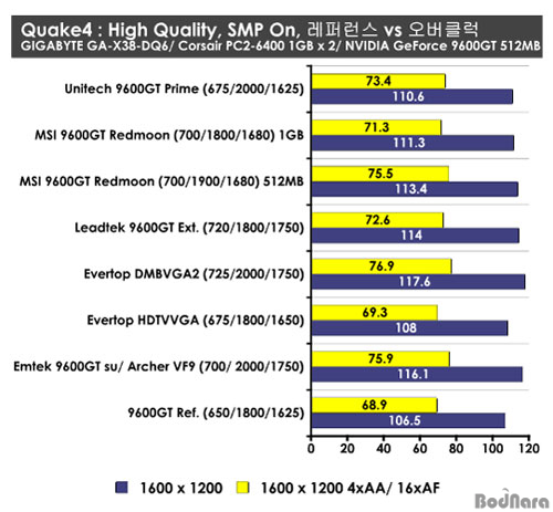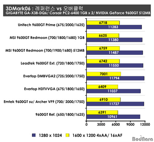 GeForce 9600GT¿Í ¿À¹öŬ·°ÀÌ Àû¿ëµÈ Á¦Ç°µéÀÇ ¼º´É Â÷À̰¡ ¾î´À Á¤µµÀÎÁö È®ÀÎÇß´Ù. Å×½ºÆ® °á°ú¸¦