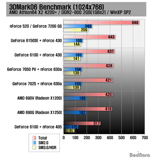 3DMark06ÀÇ Å×½ºÆ® °á°ú´Â ¿£Æ÷½º 520¿¡ ÀåÂøÇÑ 3¸¸¿øÂ¥¸® ¿ÜÀå ±×·¡ÇÈ Ä«µå ÁöÆ÷½º 7200 GS°¡ °¡Àå ³ôÀº Á¡¼öÀÎ 649Á¡À» ±â·ÏÇß°í, ³»Àå ±×·¡ÇÈ º¸µå °¡¿îµ¥´Â ÁöÆ÷½º 6150SE+430 Ĩ¼Â º¸µå°¡ 443Á¡À¸·Î 1µî, ÁöÆ÷½º 6100+405°¡ 2µîÀ» Â÷ÁöÇß´Ù. ÁöÆ÷½º 7050/7025ÀÇ °æ¿ì DirectX 9.0c Shader Model 3.0 Áö¿øÀ̶ó´Â ½ºÆå°ú ÄÚ¾î Ŭ·°±îÁö ÁöÆ÷½º 6150/6100 °è¿­°ú µ¿ÀÏÇ߱⠶§¹®¿¡ ¼º´É¿¡¼­ Ưº°È÷ ¾Õ¼³ °ÍÀÌ ¾ø¾ú´Ù.