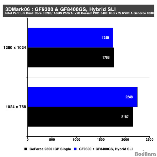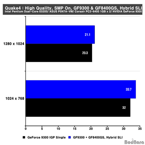 Hybrid SLIÀÇ ¼º´ÉÀ» ³ô¿©ÁÖ´Â GeForce Boost (Boost Performance)¸¦ ¼±ÅÃÇÑ ÈÄ ¼º´É Çâ»óÀ» üũÇß´Ù. GeForce 8400GS (G98)°ú ³»Àå ±×·¡ÇÈÀÎ GeForce 9300Àº ¼º´ÉÀÌ ³ôÀº ÆíÀÌ ¾Æ´Ï±â ¶§¹®¿¡ ¼º´ÉÀÇ Çâ»óÀÌ Å©°Ô ³ªÅ¸³ªÁö´Â ¾Ê¾ÒÀ¸³ª Å×½ºÆ®¸¦ ÁøÇØÇÑ 3DMark06°ú Quake4¿¡¼­ ³»Àå ±×·¡Çȸ¸À» »ç¿ëÇÒ ¶§º¸´Ù ¼º´ÉÀÌ ±Ù¼ÒÇÏ°Ô Çâ»óµÈ °ÍÀ» È®ÀÎÇÒ ¼ö ÀÖ´Ù. GeForce 9300Àº Ãʱâ Ãâ½ÃÀÎ ¸¸Å­ µå¶óÀ̹ö µîÀÇ Æ©´× µîÀ» ÅëÇØ Á¶±Ý ´õ ³ªÀº ¸ð½ÀÀ» ±â´ëÇÒ ¼ö ÀÖÀ» °ÍÀ¸·Î º¸¿©Áø´Ù.