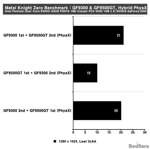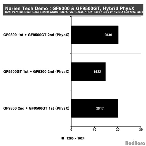 Hybrid PhysX Å×½ºÆ®´Â GeForce 9300°ú GeForce 9500GT¸¦ Á¶ÇÕÇÏ¿´°í GeForce 9300À» 2¹ø (ºÎ, 2nd), GeForce 9500GT¸¦ 1¹ø (ÁÖ, 1st)À¸·Î ¼³Á¤ÇÑ »óȲ¿¡¼­ GeForce 9300°ú GeForce 9500GT °¢°¢À» PhysX °¡¼ÓÀ¸·Î »ç¿ëÇÏ¿´À» ¶§ÀÇ °á°ú, ±×¸®°í GeForce 9500GT¸¦ 2¹ø (ºÎ, 2nd), GeForce 9300À» 1¹ø (ÁÖ, 1st)·Î ¼³Á¤ÇÏ¿´À» ¶§ÀÇ °á°ú¸¦ ºñ±³Çß´Ù.