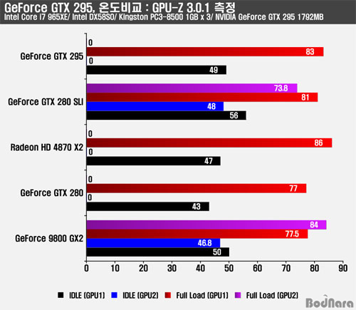GPU 2°³ÀÇ ¿Âµµ°¡ °¢°¢ ÃøÁ¤µÇ¾ú´Ù. Å×½ºÆ® °á°ú GeForce GTX 295´Â