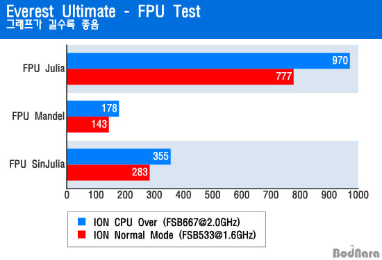 Everest·Î CPU¿Í FPU Å×½ºÆ® °á°ú¸¦ ºñ±³Çϸé 2GHz·Î ¿À¹öŬ·°µÈ ¾ÆÅè 230 ÇÁ·Î¼¼¼´Â 1.6GHzÀÏ ¶§º¸´Ù ³ô¾ÆÁø Ŭ·°¸¸Å CPU ¼º´ÉÀÌ Çâ»óµÈ´Ù.