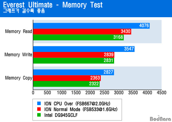 ¸Þ¸ð¸® Ŭ·°Àº FSB 533MHzÀÇ ±âº» »óÅÂ¿Í ¶È°°Àº µà¾ó ä³Î DDR2-800MHz·Î µ¿ÀÛÇÏÁö¸¸ FSB°¡ 667MHz·Î ¿Ã¶ó°¡¸é¼ CPU - ¸ÞÀκ¸µå Ĩ¼Â - ¸Þ¸ð¸® »çÀÌÀÇ µ¥ÀÌÅÍ ¼Óµµ°¡ ¿Ã¶ó°¡ Ãß°¡ÀûÀÎ ¸Þ¸ð¸® ´ë¿ªÆø Çâ»óÀÌ ÀÖ¾ú´Ù.