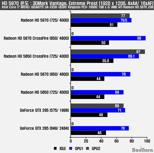 Radeon HD 5970°ú HD 5850 CF´Â AMD GPU Clock ToolÀ» ÀÌ¿ëÇÏ¿´À¸¸ç, GeForce GTX 295´Â ½Ì±Û PCB ±â¹Ý GPU¸¦ GPU-Z·Î ¿Âµµ¸¦ ÃøÁ¤ÇÏÁö ¸øÇØ Everest¸¦ ÀÌ¿ëÇß´Ù. HD 5870 CF/ HD 5870/ HD 5850/ GTX 285´Â GPU-Z 0.3.6 ¹öÀüÀ» ÀÌ¿ëÇÏ¿© ¿Âµµ¸¦ ÃøÁ¤Çß´Ù.