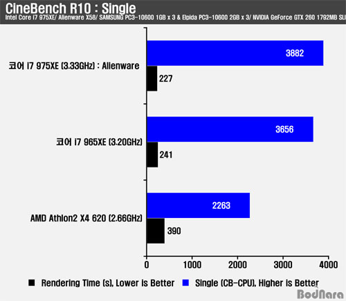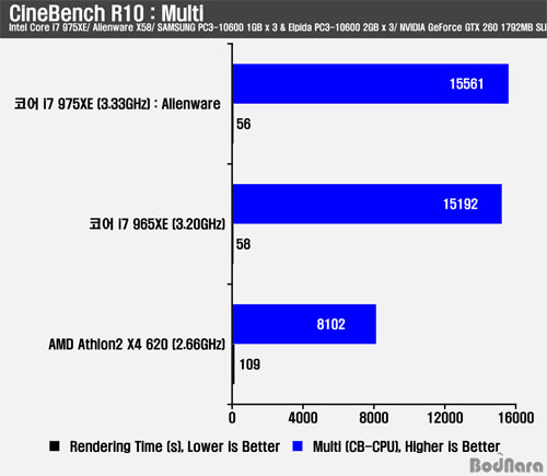 À̹ø¿¡´Â CPU ·»´õ¸µ ¼º´ÉÀ» ÄÚ¾î i7 965XE¿Í º¸±ÞÇü ÄõµåÄÚ¾îÀÎ ¾Ö½½·Ð2 X4 620°ú ºñ±³Çߴµ¥ ÄÚ¾î i7 975XE´Â 965XEº¸´Ù ¾à°£ ´õ ³ôÀº Ŭ·°ÀÌ Àû¿ëµÇ´Â ¸¸Å Çâ»óÀÌ ÀÖ¾ú°í º¸±ÞÇü ÄõµåÄÚ¾î¿Í´Â ¸ÖƼÄÚ¾î »ç¿ë½Ã 2¹è °¡±îÀÌ ºü¸¥ 󸮷®°ú ½Ã°£À» Á¦°øÇß´Ù.