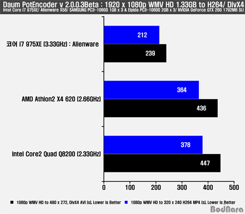 ¿µ»ó ÀçÀÎÄÚµù (Æ®·£½ºÄÚµù) ¼º´ÉÀº º¸±ÞÇü ÄõµåÄÚ¾îÀÎ AMD ¾Ö½½·Ð2 X4 620 (2.66GHz)¿Í ÄÚ¾î2 Äõµå Q8200 (2.33GHz)¿¡¼ Å×½ºµÈ °Í°ú ºñ±³Çߴµ¥ ¿¡À̸®¾ð¿þ¾î ¿À·Î¶ó ALX´Â ÇÏÀÌÆÛ½º·¹µù Áö¿øÀ¸·Î 8 ½º·¹µå¸¦ Áö¿øÇÏ´Â ÄÚ¾î i7 975XE (333GHz)¿Í DDR3-1333MHz 9GB ¸Þ¸ð¸® ¿ë·® Á¦°øÀ» ÅëÇØ CPU ¿¬»ê ¼º´É ¹× ¸Þ¸ð¸® ´ë¿ªÆø Çâ»óÀ» ¹ÙÅÁÀ¸·Î º¸±ÞÇü ÄõµåÄÚ¾î CPUµéº¸´Ù ºü¸¥ Æ®·£½ºÄÚµù ¼º´ÉÀ» ³»ÁÖ°í ÀÖ´Ù.