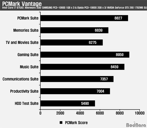 PCMark Vantage´Â À©µµ¿ì ºñ½ºÅ¸ ÀÌ»óÀÇ ¿î¿µÃ¼Á¦¿¡¼ µ¿À۵Ǹç, ½Ã½ºÅÛÀÇ Àü¹ÝÀûÀÎ ¼º´ÉÀ» ÃøÁ¤ÇÒ ¼ö ÀÖ´Ù. PCMark VantageÀÇ ¼º´ÉÀº Á÷Á¢ÀûÀ¸·Î ºñ±³ÇÑ Á¦Ç°ÀÌ ¾ø¾î ¿¡À̸®¾ð¿þ¾î ¿À·Î¶ó ALX ÇϳªÀÇ ±×·¡ÇÁ¸¸ ±×·ÈÀ¸¸ç, Áö³ ³»Àå ±×·¡ÇÈ ¸ÞÀκ¸µå 23Á¾ ºñ±³ º¥Ä¡¸¶Å© ±â»ç¿¡¼ º¸±ÞÇüÀ¸·Î ½Ã½ºÅÛÀ» ±¸ÃàÇÒ ¼ö ÀÖ´Â AMD ¾Ö½½·Ð2 X2 250°ú AMD 780G Á¶ÇÕÀÇ PCMark Vantage Àüü ½ºÄÚ¾î´Â 4406, ÀÎÅÚ ÆæÆ¼¾ö µà¾óÄÚ¾î E6300°ú G31 Á¶ÇÕÀº 4397·Î PCMark Vantage Àüü ½ºÄÚ¾î·Î¸¸ ºñ±³Çϸé 2¹è °¡±î¿î ½ºÄھ ±â·ÏÇß´Ù.