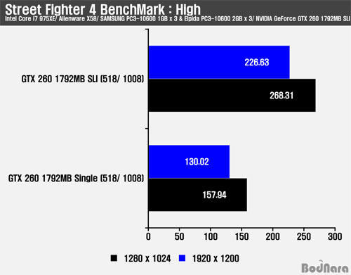 Street Fighter 4 BenchMarkÀÇ ¼º´ÉÀº ½Ì±Û°ú SLI ±¸¼º¸¸À» ºñ±³Çß´Ù. ¿¡À̸®¾ð ¿À·Î¶ó ALX ½Ã½ºÅÛ¿¡¼´Â Å×½ºÆ®µÈ ÇØ»óµµº° 100fps ÀÌ»óÀ» ±â·ÏÇß°í SLI ¸ðµå¿¡¼´Â 200fpsÀÇ ¼º´ÉÀ» ³»Áá´Ù.