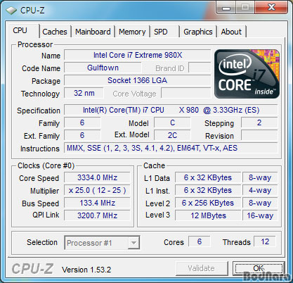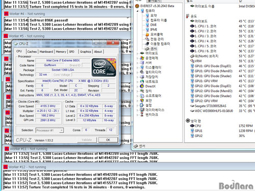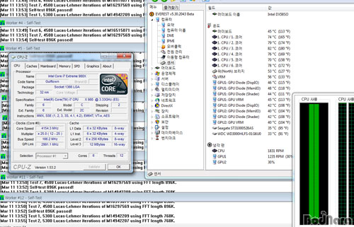 ÄÚ¾î i7 980X´Â ÀÎÅÚ DX58SO ¸ÞÀκ¸µå¿¡¼ Everest·Î ¸ð´ÏÅ͸µµÈ CPU Àü¾ÐÀ» È®Àΰá°ú 1.15-1.16V ¼öÁØÀ¸·Î ÃøÁ¤µÇ¸ç, 3333.8MHz (133.4 x 25.0)ÀÇ Å¬·°ÀÌ Àû¿ëµÈ´Ù.