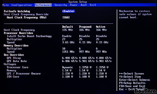 ÄÚ¾î i7 980XÀº DX58SO ¸ÞÀκ¸µå¿¡ ÀåÂø½Ã EverestÀÇ ¸ð´ÏÅ͸µÀ» ÀÌ¿ëÇÏ¿© CPU Àü¾ÐÀ» È®ÀÎÇϸé 1.15V-1.16V »çÀÌ·Î ÃøÁ¤µÈ´Ù. ¿©±â¿¡ ±âº» Á¦°ø Äð·¯ÀÇ Q¸ðµå¸¦ ÀÌ¿ëÇÏ¸é¼ 0.2150V¸¦ Ãß°¡Àΰ¡ÇÏ¿© 1.3750V·Î 4154.1 (166.2 x 25.0)MHz·Î ¿À¹öŬ·°ÀÌ °¡´ÉÇß´Ù. QPI Ŭ·°Àº 4.8GT/s¸¦ ¼±ÅÃÇÏ¿© 2998 (166 x 18)MHz¸¦ Àû¿ëÇß°í ¸Þ¸ð¸®´Â DDR3-1333MHz, NB Ŭ·°Àº 2656 (166 x16)MHz·Î ¼³Á¤Çß´Ù.