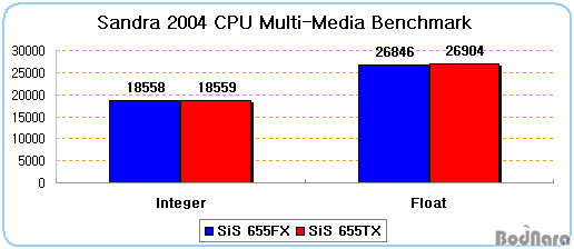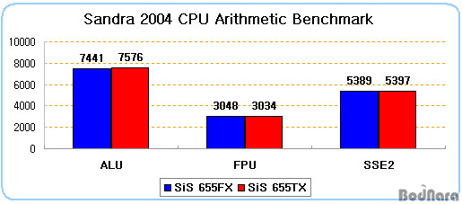 »óÅ¿¡¼ ´Ù½Ã Å×½ºÆ®¸¦ ÇÏ¿´´Ù. Sandra 2004ÀÇ CPU Å×½ºÆ®¿¡¼´Â ÀÌÀü°ú °°Àº °á°ú°¡ ³ª¿ÔÀ¸¸ç 655TX¿¡¼ ¾Õ¼¹´ø ALU