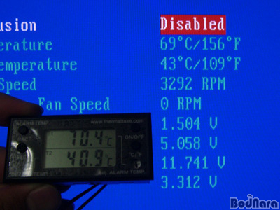 ¹ÙÀÌ¿À½º¿¡ ÁøÀÔÇÑ ÈÄ IDLE »óÅ¿¡¼­ÀÇ ¿Âµµ ¸ð´ÏÅ͸µ °á°úÀÌ´Ù. ¹ÙÀÌ¿À½º¿¡¼­ ÃøÁ¤µÈ ¿Âµµ´Â 69µµÀÌÁö¸¸, µðÁöÅÐ ¿Âµµ°è¿¡ Ç¥½ÃµÈ ¿Âµµ´Â 40.9µµ·Î 29µµ¿¡ ´ÞÇÏ´Â ±²ÀåÈ÷ Å« ¿Âµµ Â÷À̸¦ º¸À̰í ÀÖ´Ù. ÄÚ¾î ³»ºÎÀÇ ¿Âµµ¿Í È÷Æ®½ÌÅ©¿¡ Àü´ÞµÇ´Â ¿Âµµ¿¡ ¾à°£ÀÇ ÆíÂ÷°¡ ÀÖÀ» ¼ö´Â ÀÖÁö¸¸, Äð·¯ÀÇ Àå·Â µîÀ» »ý°¢Çϸé ÀÌ Á¤µµÀÇ ÆíÂ÷´Â ¹ÙÀÌ¿À½ºÀÇ ¸ð´ÏÅ͸µ¿¡ ¹®Á¦°¡ ÀÖ´Â °ÍÀÌ´Ù. 3300RPM Á¤µµÀÇ ÆÒ ½ºÇǵ忡 IDLE »óÅ¿¡¼­ 41µµ Á¤µµ¶ó¸é ¸¸Á·½º·¯¿î ¼öÁØÀÇ ¹ß¿­ÀÌ´Ù.