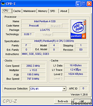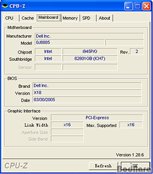 CPU-Z·Î CPUÀÇ Á¤º¸¿Í ¸ÞÀκ¸µåÀÇ Á¤º¸¸¦ »ìÆìº¸¾Ò´Ù. CPU´Â Dimension 4700¿¡¼­ »ç¿ëµÇ¾ú´ø °Í°ú µ¿ÀÏÇÑ Prescott 530 CPU°¡ »ç¿ëµÇ¾ú´Ù. FSB 800MHz, L2 ij½¬ 1MB, SSE3¸¦ ¸ðµÎ Áö¿øÇϸç Á¦Á¶ °øÁ¤Àº 90nmÀÌ´Ù. ¸ÞÀκ¸µå´Â ÀÎÅÚ µà¾ó ÄÚ¾îÀÎ ÆæÆ¼¾ö D±îÁö Áö¿øÀÌ °¡´ÉÇÑ i945G Express Ĩ¼ÂÀ» »ç¿ëÇϰí ÀÖ´Ù. ¹ÙÀÌ¿À½º ¹öÀüÀÇ °æ¿ì 2005³â 3¿ù 30ÀÏ·Î °ÅÀÇ ¼®´Þ Àü¿¡ Àû¿ëµÈ ¹öÀüÀÌ´Ù. Intel GMA 950 ±×·¡ÇÈ Äھ ³»ÀåÇϰí ÀÖÁö¸¸ PCI-Express x16 ½½·Ôµµ Á¦°øÇÑ´Ù.