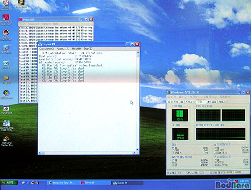 Super Pi¸¦ µ¿½Ã¿¡ ½ÇÇàÇÏ¿© CPU°¡ 100% Ç®·Îµå¸¦ À¯ÁöÇϵµ·Ï ÇÏ¿´´Ù. (´Ù¸¸ Prime Å×½ºÆ®´Â °è»ê ´Ü°è°¡ ³Ñ¾î°¥ ¶§¸¶´Ù ¾à°£¾¿