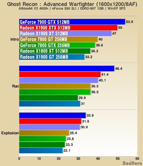 ±× ÀÌÇÏÀÇ Á¦Ç°À»Àº 1~3À§ Á¦Ç°µé°ú ¾à°£ÀÇ Â÷À̸¦ º¸¿´´Âµ¥, ƯÈ÷ GeForce 7900 GT´Â ÃÖ»ó±Þ Á¦Ç° ¹Ù·Î ¾Æ·¡ÀÇ Å×½ºÆ® °á°ú¸¦ ±â·ÏÇÏ¿´À¸³ª, ATI¿¡¼­ À̸¦ °ßÁ¦Çϱâ À§ÇØ ³»³õÀº Radeon X1900 GT´Â À̺¸´Ù 7~8 ÇÁ·¹ÀÓÀÌ ³·Àº °á°ú¸¦ º¸¿©ÁÖ¾ú´Ù.