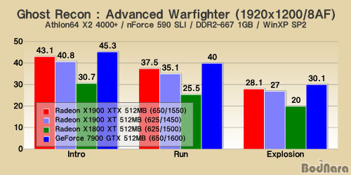 1920x1200 ÇØ»óµµÀÇ Å×½ºÆ®´Â 512MBÀÇ ¸Þ¸ð¸®¸¦ °¡Áø ±×·¡ÇÈ Ä«µåµé¸¸ Æ÷ÇÔÇÏ¿© ÁøÇàÇߴµ¥, GeForce 7900 GTX 512MB°¡ ÇÁ·¹ÀÓÀÌ °¡Àå ¶³¾îÁö´Â Æø¹ß Å×½ºÆ®µµ Æò±Õ 30 ÇÁ·¹ÀÓÀ» ³Ñ¾î¼­¸ç °¡Àå ³ôÀº °á°ú¸¦ º¸¿´À¸¸ç, Radeon X1900 XTX¿Í XT´Â 2, 3À§¸¦ ±â·ÏÇß´Ù. °°Àº 512MBÀÇ ±×·¡ÇÈ Ä«µå ¸Þ¸ð¸®¸¦ °¡Áö±ä ÇßÁö¸¸.. Radeon X1800 XT´Â À̵麸´Ù Å©°Ô ³·Àº °á°ú¸¦ º¸¿©ÁÖ¾ú´Ù.