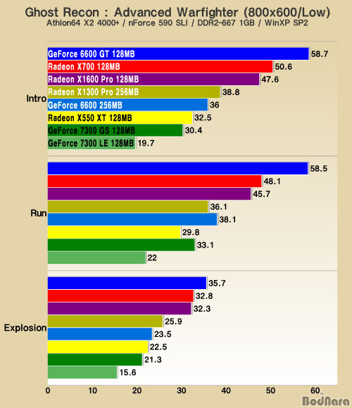 Å×½ºÆ® °á°ú Æò±Õ 30 ÇÁ·¹ÀÓ ±Ùó¿´´ø GeForce 6600 GT 128MB°¡ Run ¸ðµå¿¡¼­ 58.5 ÇÁ·¹ÀÓÀ¸·Î 1À§¸¦ ±â·ÏÇßÀ¸¸ç, »ý°¢Áöµµ ¸øÇß´ø Radeon X700ÀÌ Radeon X1600 Pro¸¦ ÀâÀ¸¸é¼­ 2À§¿¡ ¿Ã¶ó¼¹´Ù.