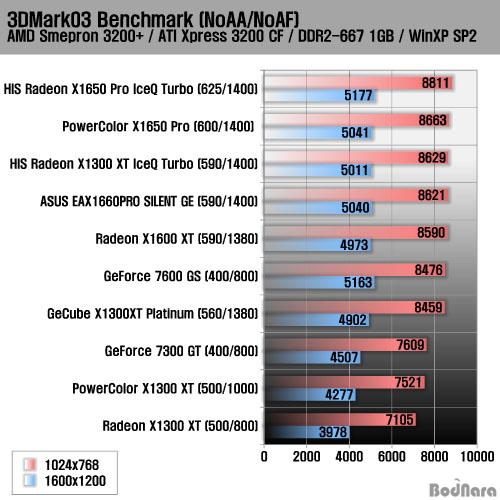 ¿ì¼± 3DMark03 º¥Ä¡¸¶Å© °á°ú¸¦ »ìÆìº¸¸é Radeon X1650 Pro°¡ GeForce 7600 GS¸¦ ¾Õ¼°í ÀÖÀ¸³ª ·¹ÆÛ·±½º Ŭ·°ÀÇ Radeon X1300 XTÀº GeForce 7300 GTº¸´Ù ¼º´ÉÀÌ ³·Àº °ÍÀ¸·Î ³ªÅ¸³µ´Ù. ±âÁ¸ÀÇ Radeon X1600 XTµµ 3DMark Á¡¼ö·Î´Â GeForce 7600 GS¸¦ À̱â°í ÀÖ¾úÀ¸¹Ç·Î ±×¸® ³î¶ó¿î °á°ú´Â ¾Æ´Ï´Ù.