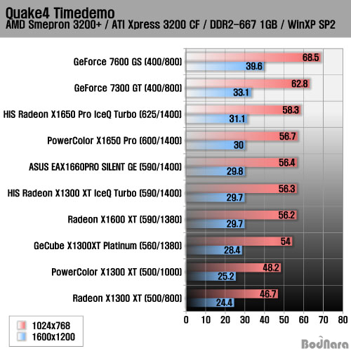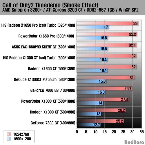 ¿¬¸·ÅºÀ» ÅͶ߷Á ½º¸ðÅ©(Smoke) È¿°ú¸¦ ÁØ Call of Duty2ÀÇ Å¸ÀÓµ¥¸ð Æò±Õ ÇÁ·¹ÀÓÀ» ÃøÁ¤ÇÑ °á°ú 3DMark06°ú °ÅÀÇ °°Àº ¼ø¼·Î Radeon X1650 Pro¿Í X1600 XT°¡ GeForce 7600 GS¸¦ À̰åÀ¸¸ç, ·¹ÆÛ·±½º Ŭ·°À¸·Î ¸ÂÃá Radeon X1300 XTµµ GeForce 7300 GTº¸´Ù ³ôÀº ¼º´ÉÀ» ±â·ÏÇß´Ù.