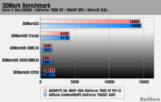 ±×·¯³ª 3D º¥Ä¡¸¶Å© ÇÁ·Î±×·¥ÀÎ 3DMark03°ú 06 ¹öÀüÀÇ ¼º´É Å×½ºÆ® °á°ú´Â µÎ ½Ã½ºÅÛÀÇ ¼º´É Â÷À̰¡ °ÅÀÇ ¾ø´Â °ÍÀ¸·Î ³ªÅ¸³µ´Ù. »ç½Ç ¾çÂÊ ¸ðµÎ °°Àº µ¿ÀÛ Å¬·°ÀÇ GeForce 7600 GT¸¦ »ç¿ëÇϰí ÀÖÀ¸¹Ç·Î ½Ã½ºÅÛº¸´Ù ±×·¡ÇÈ Ä«µå ¼º´É¿¡ ¿µÇâÀ» ¹Þ°Ô µÇ´Â 3DMark¿¡¼­ Å« Â÷À̰¡ ³¯ ÀÏÀº ¾ø´Ù.