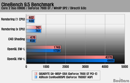 CineBench 9.5 º¥Ä¡¸¶Å© °á°ú¸¦ »ìÆìº¸¸é CPU, ±×·¡ÇÈ ¼º´É ¸ðµÎ GeForce 7600 GT PCI Express Á¦Ç°À» ´Ü P965 º¸µå¿Í º° Â÷À̰¡ ¾ø¾ú´Ù. ÀϺΠÇ׸ñÀº ¾Õ¼­°í ÀϺΠÇ׸ñÀº µÚÃÄÁö°í ÀÖÁö¸¸ ÀÌ Á¤µµ¸é ºñ½ÁÇÑ ¼º´ÉÀ̶ó°í »ý°¢ÇÒ ¼ö ÀÖ´Ù. ConRoe865PE°¡ ½ÇÁ¦·Î´Â FSB 1066MHzº¸´Ù ¾à°£ ³·Àº FSB°¡ µé¾î°¡°í ÀÖÀ½À» °¨¾ÈÇÏ¸é ´ëµîÇÏ´Ù°í »ý°¢µÈ´Ù.