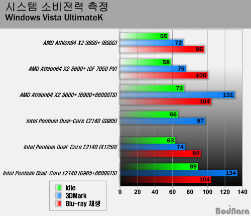 °á±¹ ¼ÒºñÀü·Â¸¸À¸·Î º»´Ù¸é Athlon64 X2 3600+¿Í Pentium Dual-Core E2140Àº Idle »óÅ¿¡¼­¸¸ AMD¿¡ À¯¸®ÇÏ°í ½ÇÁ¦·Î ½Ã½ºÅÛÀÌ Ç®·Îµå µÇ´Â ȯ°æ¿¡¼­´Â Å« Â÷À̰¡ ¾ø´Ù°í ÇÒ ¼ö ÀÖ´Ù. ±×¸®°í ºí·ç·¹ÀÌ ¿µÈ­¸¦ º¼ ¶§´Â ¼ÒºñÀü·ÂÀº ³»Àå ±×·¡ÇÈ ½Ã½ºÅÛÀ̳ª ¿ÜºÎ ±×·¡ÇÈ Ä«µå¸¦ »ç¿ëÇÑ °ÍÀ̳ª ºñ½ÁÇÏÁö¸¸ ½ÇÁ¦·Î´Â ³»Àå ±×·¡ÇÈÀ» ¾²¸é È­¸éÀÌ ºÎµå·´Áö ¸øÇÏ°í ²÷±â´Â Àϵµ ÀÖÀ¸¹Ç·Î °¡¼Ó ±â´ÉÀ» Áö¿øÇÏ´Â ¿ÜºÎ ±×·¡ÇÈ Ä«µå¸¦ ¾²´Â°Ô ÈξÀ ³´´Ù.