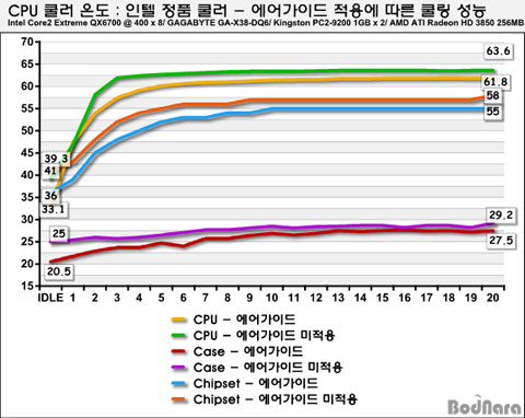 Å×½ºÆ® °á°ú ¿¡¾î°¡À̵带 ÀåÂøÇÒ °æ¿ì¿Í ÀåÂøÇÏÁö ¾ÊÀ» ¶§ÀÇ °á°ú´Â ¿¡¾î°¡À̵带 »ç¿ëÇÏ¿´À» ¶§ CPU¿Í ÄÉÀ̽º ³»ºÎ, Ĩ¼ÂÀÇ ¿Âµµ´Â °¢°¢ 1.8/ 1.7/ 3µµÀÇ Â÷À̸¦ º¸¿© CPU¿Í ÄÉÀ̽º ³»ºÎÀÇ ¿Âµµº¸´Ù ÁÖº¯ºÎÀΠĨ¼ÂÀÇ ¿Âµµ°¡ ´õ ³·°Ô ÃøÁ¤µÇ¾î ÁÖº¯ºÎÀÇ ¿Âµµ Ç϶ôÀÌ ´õ Å©°Ô ÀÛ¿ëÇÏ´Â °ÍÀ¸·Î ³ªÅ¸³ª°í ÀÖ´Ù.