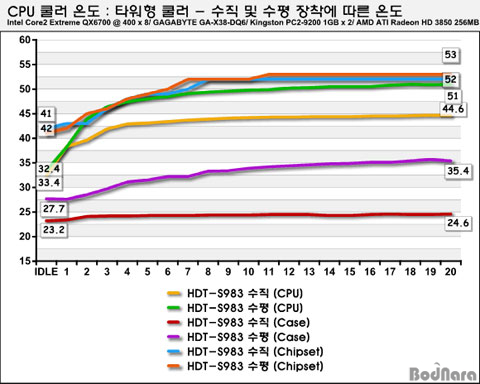°á°úÀûÀ¸·Î Ÿ¿öÇü Ä𷯵éÀ» »ç¿ëÇÒ ¶§´Â ÄÉÀ̽ºÀÇ Á¦¾àÀÌ µû¸£Áö ¾Ê´Â´Ù¸é, ÄÉÀ̽º ÈÄ¸é ÆÒ°ú ÀÏÄ¡µÇ´Â Áï, ¼öÁ÷ ¹æÇâÀ¸·Î Ä𷯸¦ ¼³Ä¡ÇØÁÖ´Â °ÍÀÌ ¼º´É¸é¿¡¼­ ´õ À¯¸®ÇÏ´Ù´Â °ÍÀ» È®ÀÎ °¡´ÉÇÏ´Ù. ´Ù¸¸, HDT-S983ÀÇ Ä𸵠ÆÒÀÇ µ¿ÀÛ ¼Óµµ¸¦ ÃÖ´ë·Î µ¿ÀÛÇÑ »óȲ¿¡¼­ÀÇ °á°úÀ̱⠶§¹®¿¡ ¼ÒÀ½À» °í·ÁÇÏ¿© Äð·¯ÀÇ Ä𸵠ÆÒÀÇ µ¿ÀÛ ¼Óµµ¸¦ ³·Ãâ °æ¿ì ÀÌ °á°úº¸´Ù ÄÉÀ̽º ³»ºÎÀÇ ¿Âµµ µî¿¡ Â÷À̰¡ Á¼ÇôÁú ¼ö´Â ÀÖ´Ù.