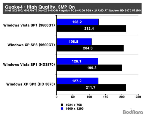 Quake4ÀÇ ¿î¿µÃ¼Á¦ º° ¼º´ÉÀ» È®ÀÎÇØº¸¾Ò´Ù.  GeForce 9600GTÀÇ °æ¿ì ÀúÇØ»óµµ¿Í °íÇØ»óµµ ¸ðµÎ