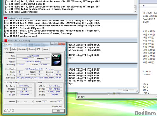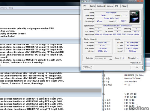 Å×½ºÆ®¿¡ »ç¿ëµÈ Æä³Ñ2 X4 940Àº CPU-Z¿¡¼­ 1.3500V·Î ÀνĵǾú°í ±âÁ¸¿¡¼­ ¹è¼ö¿Í ¹ö½º¼Óµµ Á¶Àý, ACC¸¦ Auto·Î ¼³Á¤ÇÏ¿´À» ¶§ ÃÖ°í Ŭ·°Àº 3375 (225 x 15)MHz¿´À¸¸ç, 0.25V Àü¾ÐÀ» Ãß°¡ Àΰ¡ÇÏ¿´À» ¶§´Â 3750 (250 x 15)MHz°¡ ÇÁ¶óÀÓ95¸¦ Åë°úÇÏ´Â ÃÖ°í Ŭ·°ÀÌ´Ù. ±âº»Àü¾Ð Ŭ·° Àû¿ë½Ã Everest·Î ÃøÁ¤µÇ´Â ¿Âµµ´Â 40µµ, 1.6000V·Î ¿À¹öŬ·°ÇÑ ÈÄ ÇÁ¶óÀÓ95 µ¿ÀÛ ÈÄÀÇ ¿Âµµ´Â 49µµ¸¦ ±â·ÏÇÏ¿© °Ü¿ïöÀÓÀ» °¨¾ÈÇÏ´õ¶óµµ ³ôÁö ¾ÊÀº ¿Âµµ´Ù. (À̹ÌÁö Ŭ¸¯Çϸé Å« À̹ÌÁö È®ÀÎ °¡´É)