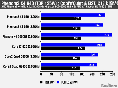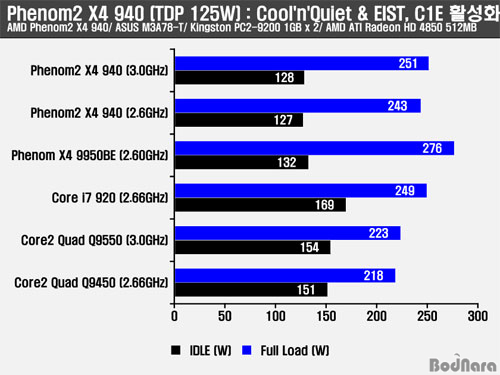 ¼ÒºñÀü·ÂÀº Àüü ½Ã½ºÅÛÀÇ ¼ÒºñÀü·ÂÀ¸·Î AMD¿Í ÀÎÅÚ CPU°¡ Áö¿øÇÏ´Â Àü·Â°ü¸® ±â¼úÀÎ Äð¾ØÄâÀÌ¾îÆ® (Cool'n'Quiet), EIST (Enhanced Intel Speedstep Technology), C1E¸¦ °¢°¢ Ȱ¼ºÈ­ÇßÀ» °æ¿ì¿Í ±×·¸Áö ¾Ê¾ÒÀ» ¶§ÀÇ ¼ÒºñÀü·ÂÀ» ÃøÁ¤Çß´Ù. Å×½ºÆ®¿¡ »ç¿ëµÈ Æä³Ñ X4 9950BE´Â 140W TDP¸¦ °¡Áø ÇÁ·Î¼¼¼­°¡ ¾Æ´Ñ 125W TDP¸¦ °¡Á® Æä³Ñ2 X4 940°ú µ¿ÀÏÇÑ 125W TDP¸¦ °¡Áø´Ù. IDLE »óÅ´ ¾Æ¹«·± ÀÛ¾÷À» ÁøÇàÇÏÁö ¾Ê¾ÒÀ» ¶§À̰í Full Load´Â ÇÁ¶óÀÓ95·Î CPU¸¦ Ç®·Îµå »óÅ·Π¸¸µé¾ú´Ù.