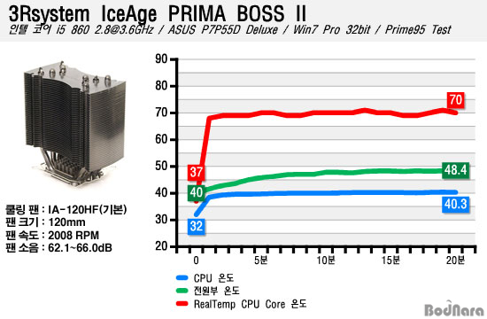 3Rsystem IceAge PRIMA BOSS II´Â ÄÚ¾î i5 860À» 3.6GHz·Î ¿À¹öŬ·°ÇßÀ» ¶§ ºÎÆÃ ÈÄ 10ºÐ °¡·®ÀÇ idle »óÅ¿¡¼ CPU 32µµ, RealTemp 37µµ, Àü¿øºÎ 40µµ¸¦ ±â·ÏÇß´Ù. Ç®·Îµå Å×½ºÆ®¿¡¼µµ 20ºÐ °æ°ú ÈÄ CPU ¿Âµµ´Â 40.3µµ(RealTemp 70µµ) ¼öÁØ¿¡ ¸Ó¹°·¶À¸¸ç, Àü¿øºÎ ¿Âµµµµ 48.4µµ·Î ºñ½ÁÇÑ Å¸¿öÇü Äð·¯ Áß¿¡ Àü¿øºÎ ¿Âµµ°¡ °¡Àå ³·¾Ò´Ù.