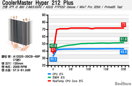 CoolerMaster Hyper 212 Plus´Â idle »óÅ¿¡¼ 33.2µµ(RealTemp 37)µµÀÇ CPU ¿Âµµ¿Í 42.6µµÀÇ Àü¿øºÎ ¿Âµµ¸¦ ±â·ÏÇß´Ù. Ç®·Îµå 20ºÐ Å×½ºÆ® °á°ú´Â CPU ¿Âµµ 43.3µµ, Àü¿øºÎ ¿Âµµ´Â 51.8µµ±îÁö ¿Ã¶ó°¬´Ù. ½Ã½ºÅÛÀÇ PWM Off¿¡¼ ÆÒ ¼Óµµ´Â 2008 RPM, ¼ÒÀ½Àº 57.5~61.2dB »çÀ̸¦ ³ªÅ¸³Â´Ù.