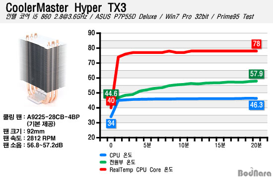 CoolerMaster Hyper TX3´Â 92mm ÆÒ°ú 3°³ÀÇ È÷Æ®ÆÄÀÌÇÁ¸¦ »ç¿ëÇÏ´Â °æ·®Çü ¸ðµ¨·Î idle »óÅÂÀÇ ¿Âµµ´Â CPU 34(RealTemp 40)µµ, Àü¿øºÎ 44.6µµ·Î Å©°Ô Â÷À̳ªÁö ¾Ê¾ÒÀ¸³ª Ç®·Îµå½Ã CPU ¿Âµµ´Â 46.3µµ(RealTemp 78µµ), Àü¿øºÎ ¿Âµµ 57.9µµ·Î ¿Ã¶ó°¬´Ù. 92mm ÆÒÀ¸·Î Ä𸵠´É·ÂÀ» ¿Ã¸®±â À§ÇØ ÆÒ ¼Óµµ´Â ÃÖ´ë 2812 RPM±îÁö ³ª¿ÔÀ¸¸ç, ÆÒ ¼ÒÀ½Àº 56.8~57.2dB·Î ÃøÁ¤µÇ¾ú´Ù.