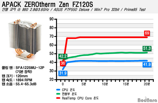 APACK ZEROtherm Zen FZ120SÀº ºÎÆÃ ÈÄ 10ºÐ µ¿¾ÈÀÇ idle »óÅ¿¡¼ CPU ¿Âµµ´Â 31.9µµ(RealTemp 36µµ), Àü¿øºÎ ¿Âµµ´Â 42.2µµ¸¦ ±â·ÏÇßÀ¸¸ç Ç®·Îµå Å×½ºÆ® 20ºÐ °æ°ú ÈÄ CPU ¿Âµµ´Â 41.9µµ(RealTemp 69µµ), Àü¿øºÎ ¿Âµµ´Â 51.3µµ¸¦ ³ªÅ¸³Â´Ù.
