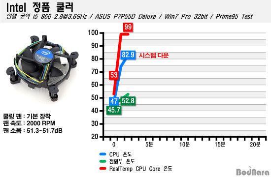 ÀÎÅÚ Á¤Ç° Ä𷯸¦ »ç¿ëÇÑ Å×½ºÆ® °á°ú ÄÚ¾î i7 860À» 3.6GHz·Î ¿À¹öŬ·°ÇÏ¸é ºÎÆÃ ÈÄ 10ºÐ µ¿¾È idle »óÅ·ΠµÎ¾úÀ» ¶§ CPU ¿Âµµ°¡ ¾à 47µµ·Î ÃøÁ¤µÇ¾ú´Ù. RealTemp ÇÁ·Î±×·¥À¸·Î È®ÀÎÇÑ Æò±Õ ÄÚ¾î ¿Âµµ ¿ª½Ã 53µµ·Î ³ô°Ô ³ª¿Ô´Ù.