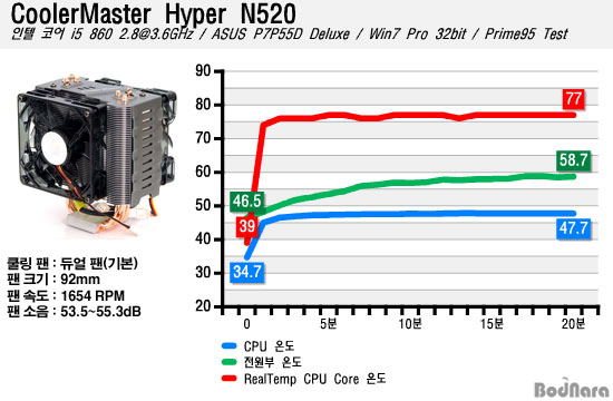 CoolerMaster Hyper N520Àº µà¾ó ÆÒ ±¸Á¶·Î ¸¸µé¾îÁö±ä ÇßÁö¸¸ 92mm ÆÒ°ú Ÿ¿öÇü Á¦Ç°µé¿¡ ºñÇØ ÀÛÀº Å©±â ¶§¹®¿¡ idle »óÅ¿¡¼´Â Å« Â÷ÀÌ´Â ¾ø¾úÁö¸¸ Ç®·Îµå½Ã CPU ¿Âµµ°¡ 47.7µµ(RealTemp 77µµ)±îÁö ¿Ã¶ó°¬´Ù. 92mm µà¾ó ÆÒ ±¸Á¶°¡ Àü¿øºÎ È÷Æ®½ÌÅ©¿¡ ÃæºÐÇÑ ¹Ù¶÷À» ºÒ¾îÁÙ ¼ö ¾ø¾î¼ÀÎÁö Àü¿øºÎ ¿Âµµ ¿ª½Ã ´Ù¸¥ Ä𷯵鿡 ºñÇØ ³ôÀº 58.7µµ¸¦ ±â·ÏÇß´Ù. ±×·¯³ª ÆÒ ¼Óµµ´Â ÃÖ´ë 1654 RPM Á¤µµ¿´°í ¼ÒÀ½µµ ´Ù¸¥ Á¦Ç°º¸´Ù ³·Àº ÆíÀ̶ó°í ÇÒ ¼ö ÀÖ´Â 53.5~55.3dB·Î ³ª¿Ô´Ù.