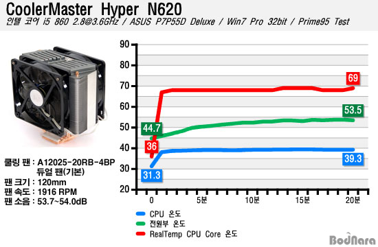 Hyper N520ÀÇ ´ëÇü ¹öÀüÀ̶ó°í ÇÒ ¼ö ÀÖ´Â Hyper N620ÀÇ ¼º´ÉÀº idle »óÅ¿¡¼ CPU ¿Âµµ 31.3µµ(RealTemp 36µµ), Ç®·Îµå½Ã 39.3µµ(RealTemp 69µµ)·Î ¾çÈ£ÇÑ °á°ú¸¦ º¸¿´´Ù. Àü¿øºÎ ¿Âµµ ¿ª½Ã 53.5µµ·Î Hyper N520º¸´Ù ÁÁ¾Ò´Ù. PWMÀ» ²°À» ¶§ÀÇ ¼Óµµ´Â 1916 RPM, ¼ÒÀ½Àº 53.7~54dB·Î µà¾ó ÆÒÀÓÀ» °¨¾ÈÇÏ¸é »ó´çÈ÷ ¾çÈ£ÇÑ ÆíÀÌ´Ù.