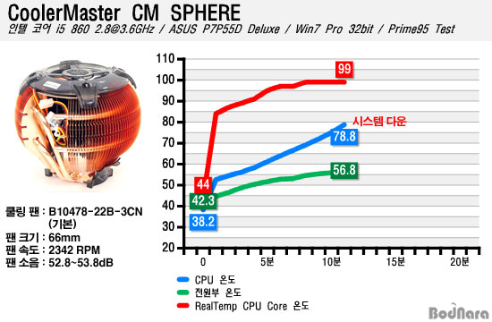 CoolerMaster CM Sphere´Â Å×½ºÆ® Äð·¯ °¡¿îµ¥ °¡Àå ¾Æ¸§´Ù¿î ¿ÜÇüÀ» °¡Áö°í ÀÖ¾úÁö¸¸ ºÒÇàÇϰԵµ ¼º´ÉÀº ¿Ü¸ð¸¦ µû¶ó°¡Áö ¸øÇß´Ù. idle »óÅÂÀÇ CPU ¿Âµµ´Â 38.2µµ·Î ´Ù¸¥ Ä𷯵鿡 ºñÇØ ³ô±ä ÇÏÁö¸¸ Å« ¹®Á¦´Â ¾ø¾î º¸ÀδÙ.