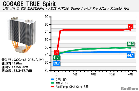 ThermalrightÀÇ ¼ºê ºê·£µå COGAGE TRUE Spirit Äð·¯´Â ºÎÆÃ ÈÄ 10ºÐ µ¿¾ÈÀÇ idle »óÅ¿¡¼ CPU ¿Âµµ 33.7µµ(RealTemp 39µµ), Àü¿øºÎ ¿Âµµ 41.1µµ¸¦ ±â·ÏÇß´Ù. 20ºÐ µ¿¾È Ç®·Îµå¸¦ µ¹·ÈÀ» ¶§´Â CPU ¿Âµµ°¡ 44.1µµ(RealTemp 73µµ), Àü¿øºÎ ¿Âµµ´Â 49.3µµ·Î ´Ù¸¥ Ÿ¿öÇü Ä𷯺¸´Ù ¼Óµµ°¡ ³·Àº(1756 RPM) ÆÒÀ» »ç¿ëÇØ¼ÀÎÁö CPU ¿Âµµ°¡ Á»´õ ³ô¾Ò´Ù. ±× ´ë½Å ¼ÒÀ½Àº 55.3~57.7dB·Î ºñ±³Àû Á¤¼÷ÇÑ ÆíÀÌ´Ù.